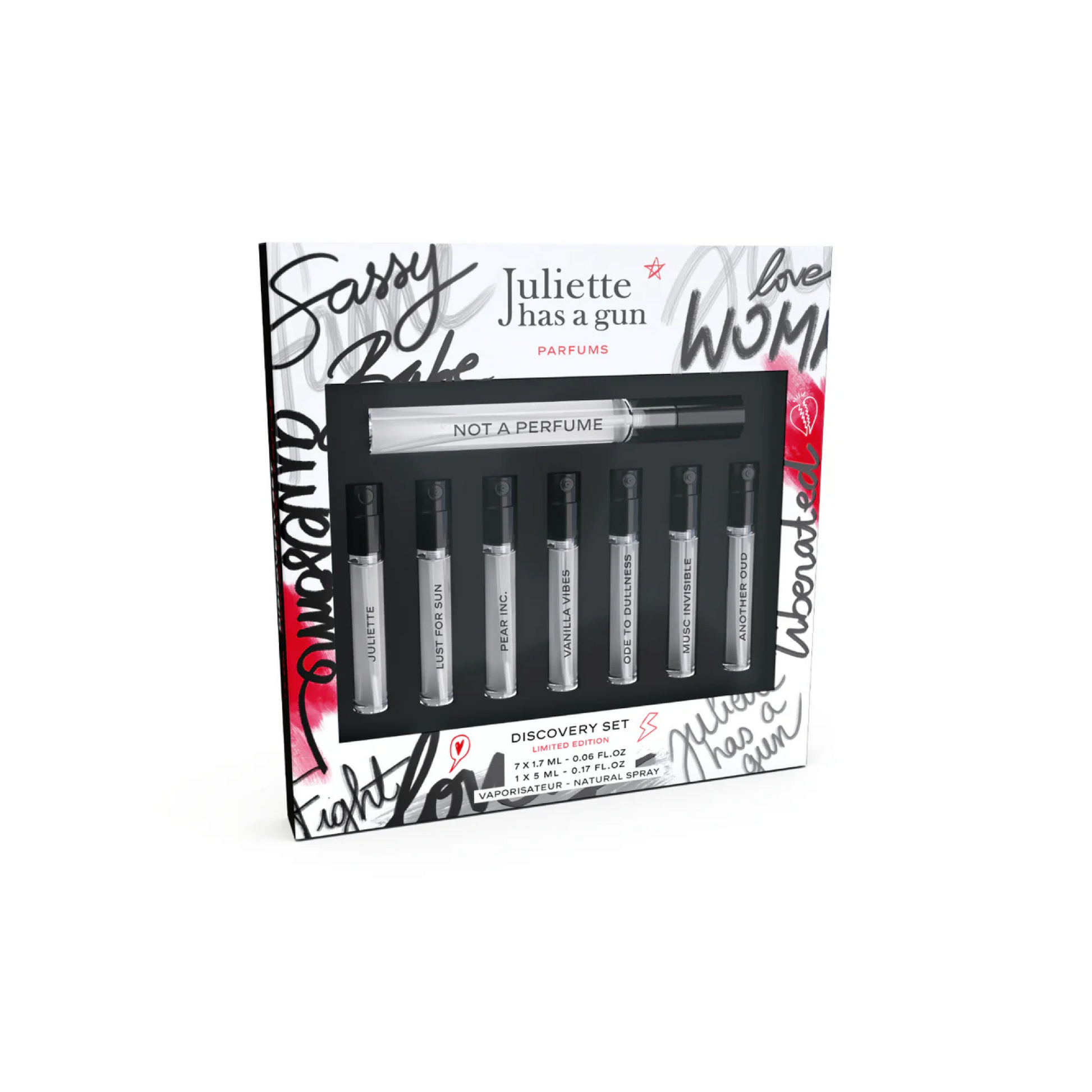 This limited edition set includes a 0.17 fl.oz (5ml) format of our iconic Not a Perfume and 0.06 fl.oz (1.7ml) formats of the following fragrances: